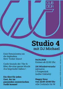 Karsamstag, 04. April, lädt Euch DJ Michael zu "Studio 4" - unserer Reminiszenz an die legendäre New Yorker Disco-Ära der 70er und 80er mit unvergesslichen Disco-Sounds